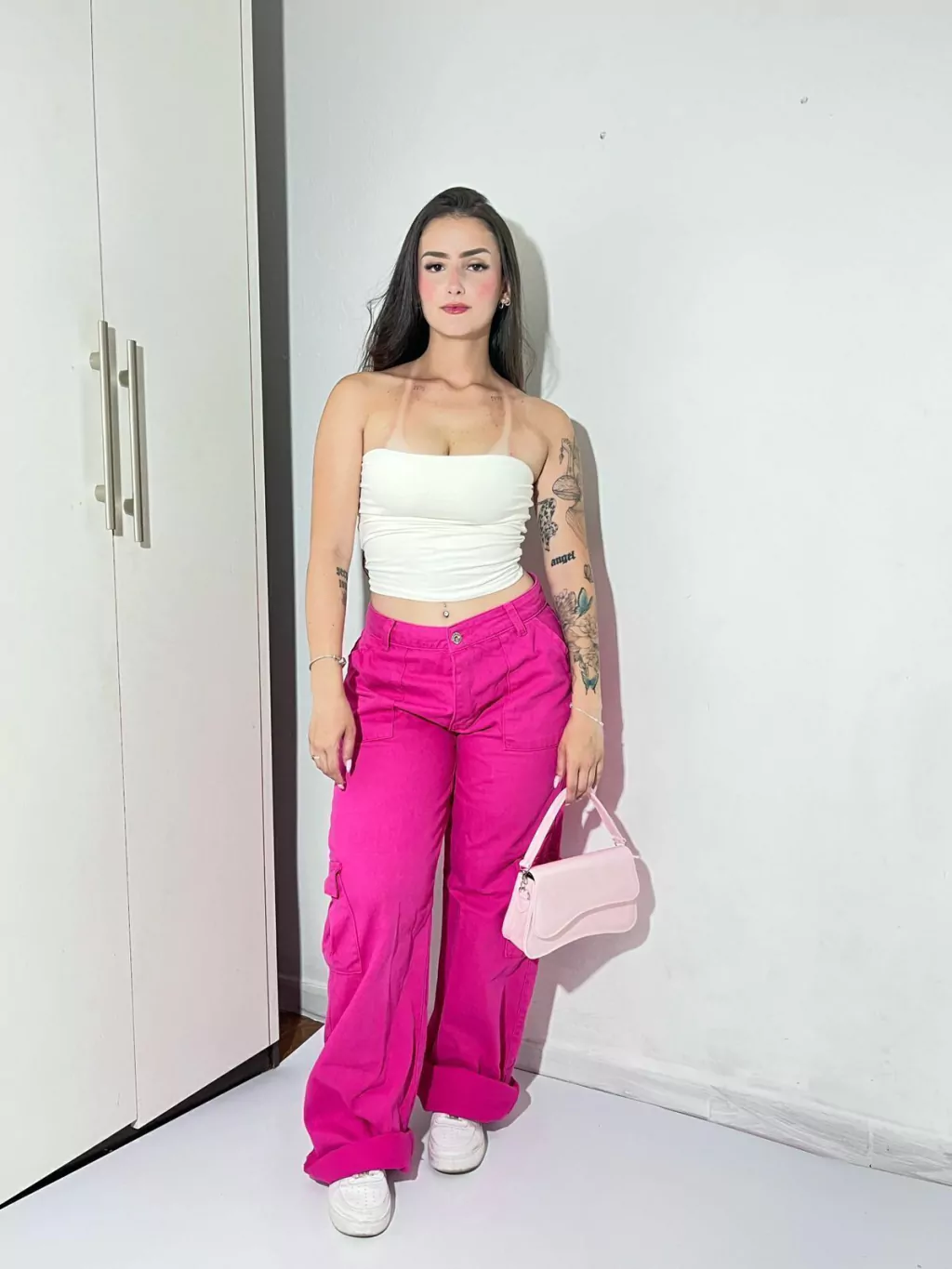 DETALHES: As modelagens cargo estão super em alta! E as nossas calças cargo jeans são perfeitas para quem gosta de uma peça tendência, descolada e mega estilosa. Está disponível na lavagem pink para se apaixonar!
